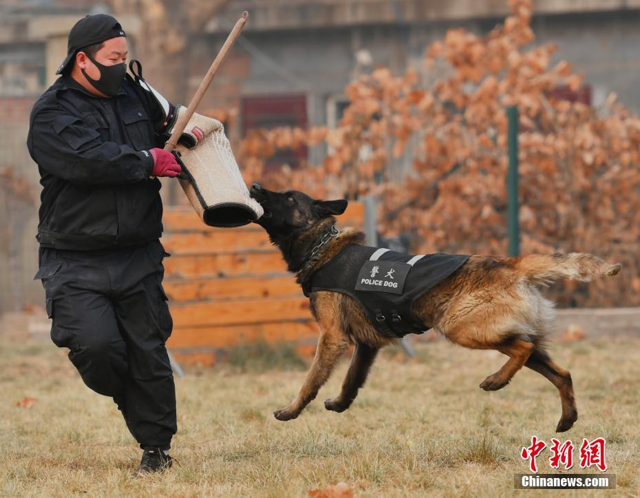 1月4日,北京铁路公安局石家庄公安处警犬工作队,警犬正在进行扑咬能力训练。为备战春运,该警犬工作队准备进行警犬拉练,其内容包括了警犬的追踪、搜捕、搜毒搜爆、扑咬、抗击打能力、耐力等内容。据了解,该警犬工作队现役警犬50余条,它们在治安巡逻、护卫、搜爆、搜毒、追踪中发挥着重要作用。中新社记者 翟羽佳 摄