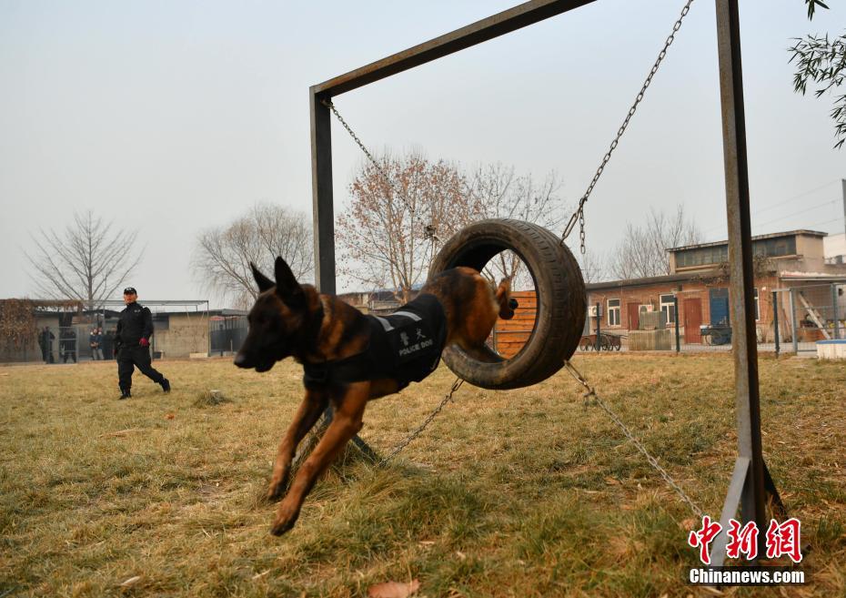 1月4日,北京铁路公安局石家庄公安处警犬工作队,正在进行体能训练的警犬。为备战春运,该警犬工作队准备进行警犬拉练,其内容包括了警犬的追踪、搜捕、搜毒搜爆、扑咬、抗击打能力、耐力等内容。据了解,该警犬工作队现役警犬50余条,它们在治安巡逻、护卫、搜爆、搜毒、追踪中发挥着重要作用。中新社记者 翟羽佳 摄