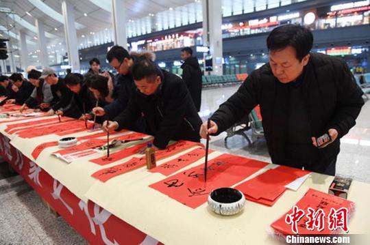 1月21日,2019年春运首日,兰州西站候车大厅内20多名书法家“挥毫泼墨”现场为出行旅客送春联。 杨艳敏 摄