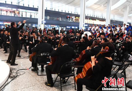 1月21日,2019年春运首日,兰州西站组织的70人交响乐团“快闪”迎春运。 杨艳敏 摄