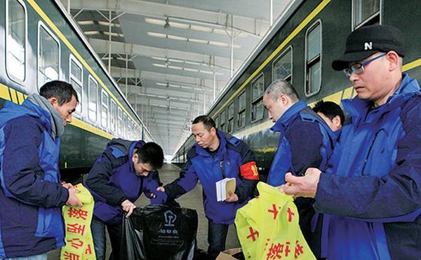1月20日,南昌南车辆段临客乘务组在为春运首趟临客列车分发安全警示带。 卢香莲摄(中经视觉)