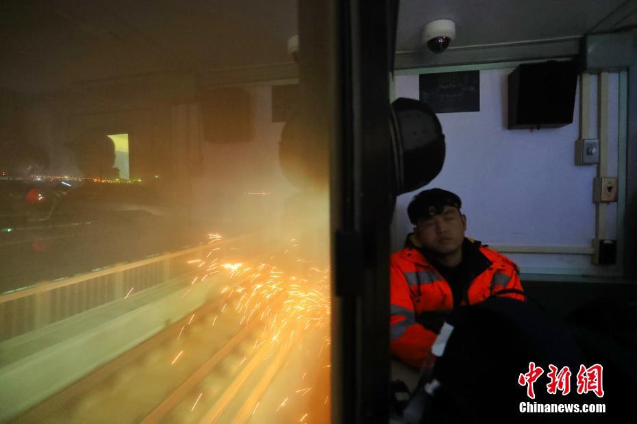 1月23日零点,一声汽笛从远方响起。鲜为人知的高铁“火花侠”驾驶着“火龙”专列,呼啸而过,“脚下”钢花飞溅,火星迸射。这就是低调的高铁守护者——钢轨打磨工。“火花侠”驾驶的作业列车车全长114米,96个砂轮在列车下被依次放下,按照设定的参数打磨铁轨,1000毫米范围内可将高差控制在0.2毫米以内,确保列车高速平稳行进。图为钢轨打磨工在清理钢渣前小歇片刻。中新社记者 张亨伟 摄