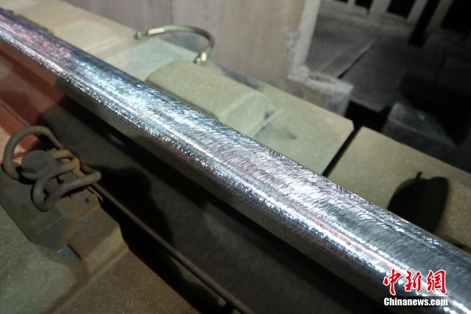 1月23日零点,一声汽笛从远方响起。鲜为人知的高铁“火花侠”驾驶着“火龙”专列,呼啸而过,“脚下”钢花飞溅,火星迸射。这就是低调的高铁守护者——钢轨打磨工。“火花侠”驾驶的作业列车车全长114米,96个砂轮在列车下被依次放下,按照设定的参数打磨铁轨,1000毫米范围内可将高差控制在0.2毫米以内,确保列车高速平稳行进。图为打磨后的钢轨。中新社记者 张亨伟 摄