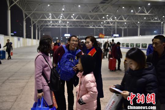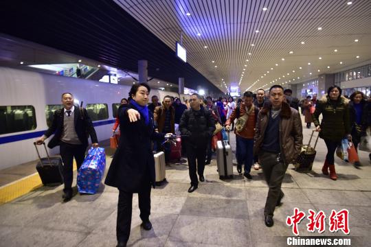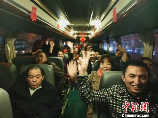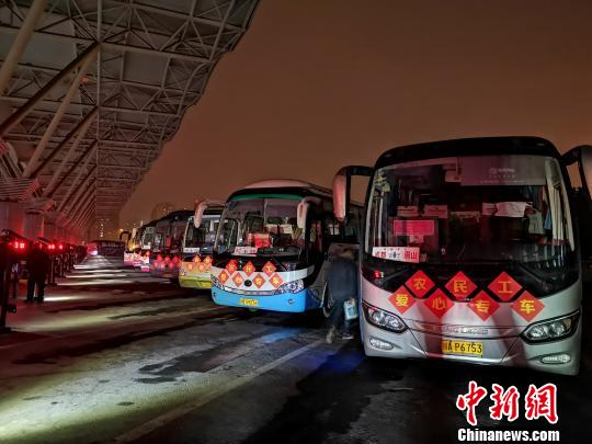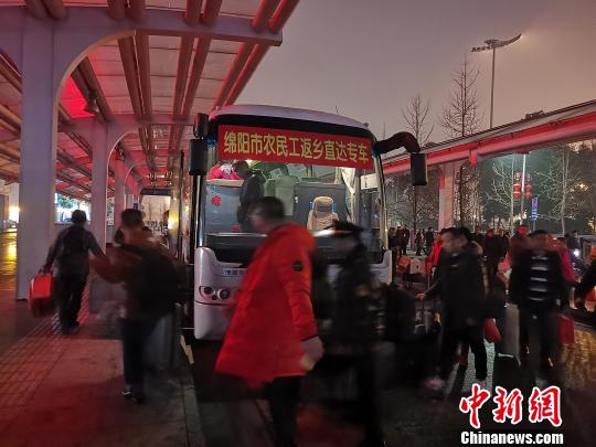 1月27日晚,首趟2019幸福列车“脱贫扶智”四川专列D1853次列车到达成都东站,来自四川凉山、绵阳、雅安、自贡等9个市州的在粤川籍农民工在车站工作人员的引导下,很快就登上了开往家乡的长途大巴。