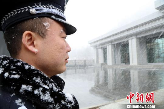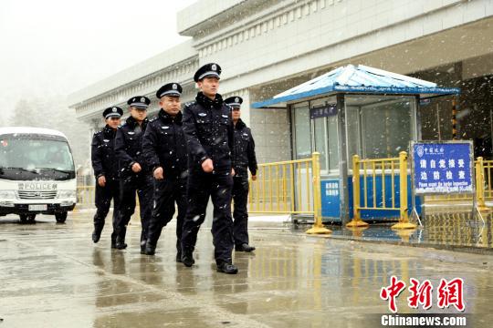 图为西藏出入境边防检查总站亚东出入境边防检查站民警在亚东口岸冒雪执勤。 张雨强 摄
