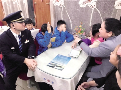 本报讯(记者 梁冰 文/图)2月14日,Z189次列车从郑州始发,一名女士向车长刘斌求助,称自己帮老乡带孩子回广州上学,一个人照顾不过来,想请列车工作人员帮忙照看。