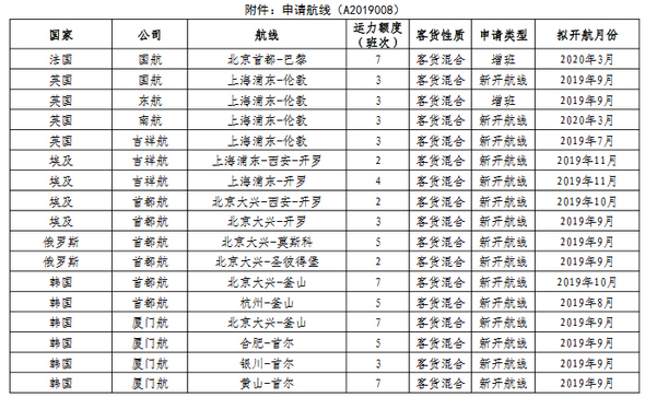 中新网客户端北京3月7日电(张旭) 中国民航局6日公布的《关于国际航线经营许可申请公示(A2019008)》显示,2019年2月26日-2019年3月4日期间,收到的部分许可申请已经过初审,现予以公示。民航局拟批准32条国际航线许可中,有10条是从北京大兴国际机场(北京新机场)起飞的航线。