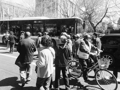 4月14日上午10点,记者来到距离陶然亭公园北门300余米处的太平街公交站。此时,站台上挤满了老人,还有不少老人站到了马路牙子外,他们都伸着头向公交车来的方向张望着。在这个公交站设有一张矮凳,只能容两人并排而坐。而大部分没座儿的老人们,只得把身子倚靠在公交车站牌。