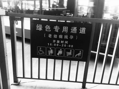 《北京市“十三五”时期老龄事业发展规划》中提出,在公交地铁、机场、火车站等交通枢纽设置老年人等候专区,保障老年人优先通行,打造“老年友好型城市”。记者探访四惠公交枢纽站,只在一处站台发现绿色专用通道。