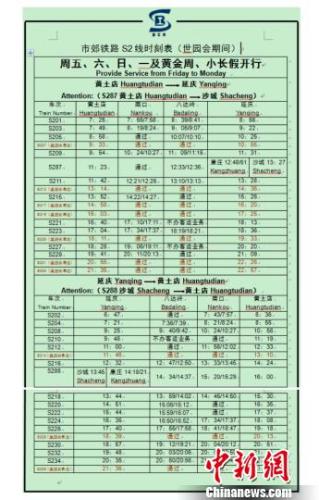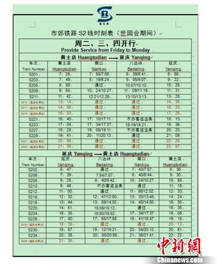 为服务游客前往世园会,自4月30日起,S2线开行“世园会专线直通车”,周五、六、日、一,黄土店直通延庆7列、延庆直通黄土店3列,周二、三、四,黄土店直通延庆5列,延庆直通黄土店2列。“世园会专线直通车”全程只需82分钟。