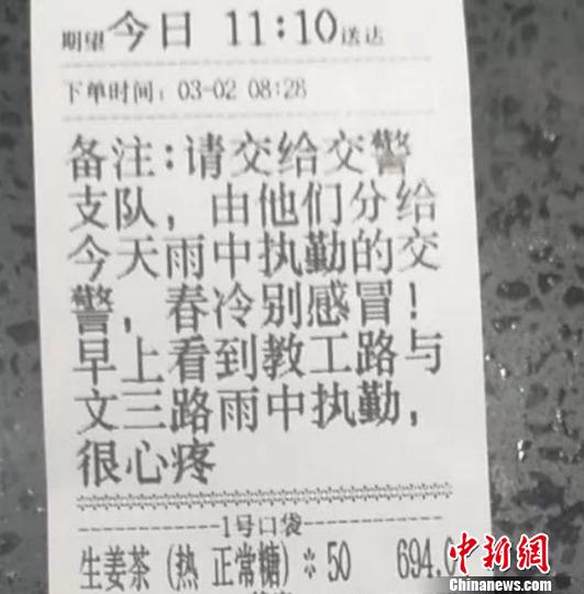 2018年3月的一个早晨,由于看到交警们在雨中执勤,一位热心市民点了50杯热生姜茶外卖送往文教中队。“交警同志是在执行工作没错,可这工作值得我们发自内心地去敬重与关爱。”这位热心市民当时说。
