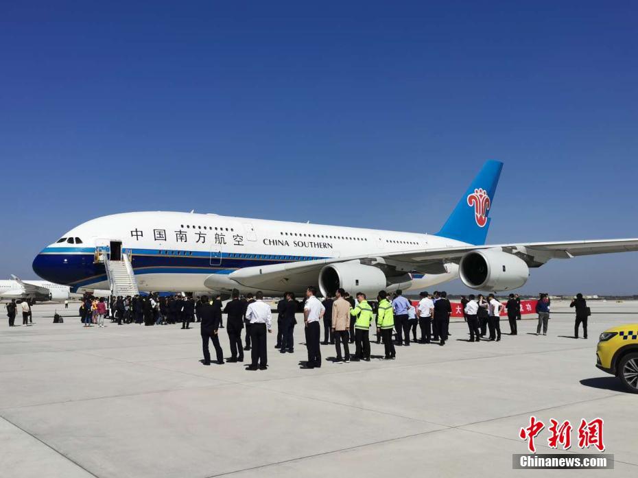 5月13日上午9时29分,首架试飞飞机——南航A380从首都机场成功飞抵北京大兴国际机场西一跑道。 中新社记者 周音 摄