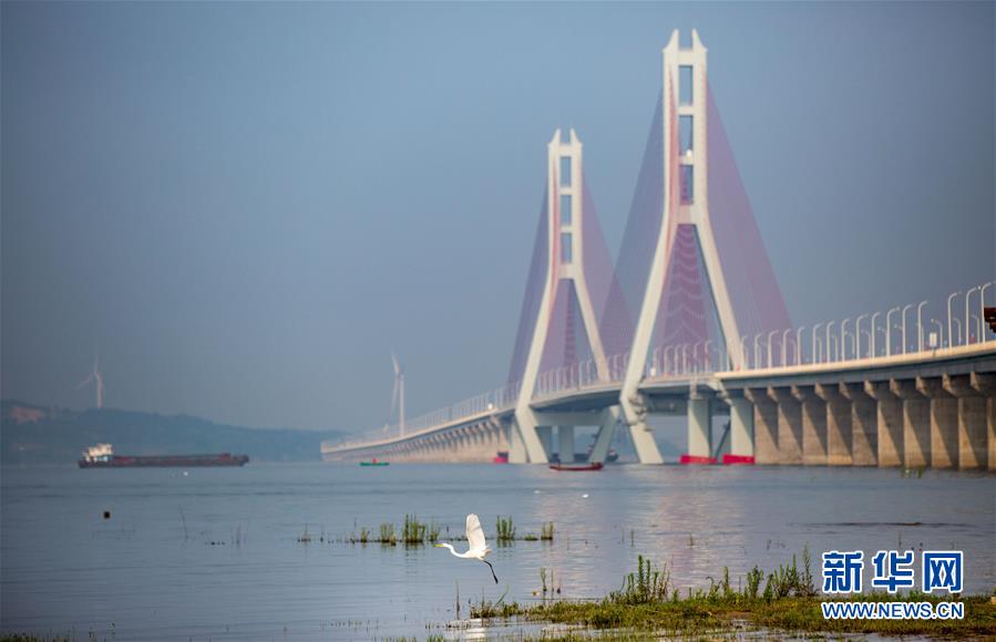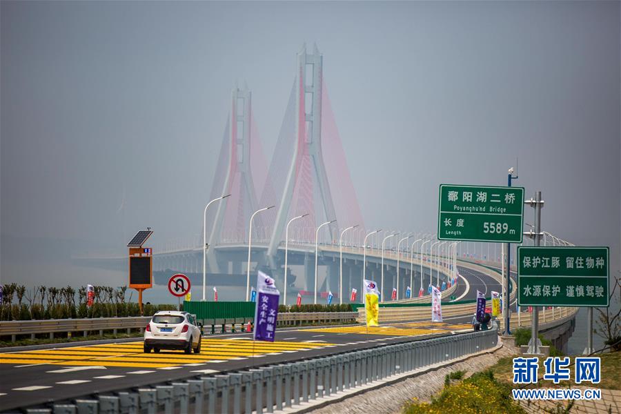 这是6月28日拍摄的鄱阳湖二桥一景。 6月28日,江西鄱阳湖二桥举行正式通车仪式,标志着环鄱阳湖地区的又一重要交通控制性工程正式投入使用。据介绍,鄱阳湖二桥全长5.589公里,起自江西都昌县多宝乡,终于庐山市华林镇。桥梁采用主跨达420米的双塔斜拉桥,尽可能减小桥墩物理障碍对鱼类迁移的影响。这也是中国第一大淡水湖鄱阳湖上建成的第二座大桥。 新华社发(傅建斌 摄)