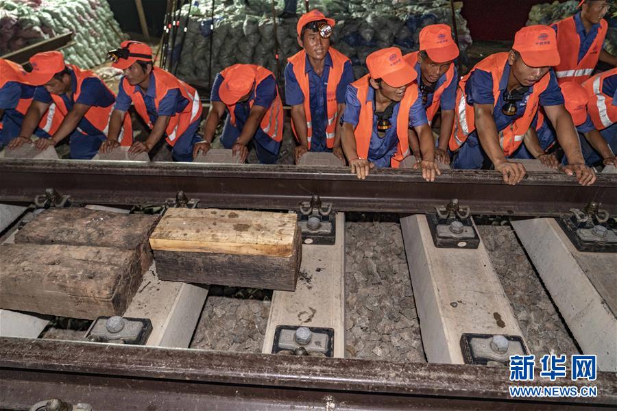 7月19日凌晨,中铁十一局三公司职工在推入道岔。 7月19日7时许,经过中铁十一局及相关参建单位1000多名建设者连续8小时奋战,昌赣高铁引入南昌铁路枢纽(向莆铁路)下行线施工顺利完成,昌赣高铁正式接入“八纵八横”国家高铁网络。 昌赣高铁全长415.734公里,北起江西南昌,南至赣州,设计时速350公里。这条高铁建成通车后,井冈山革命老区、赣南等原中央苏区将正式迈入高铁时代。 新华社记者 杜华举 摄