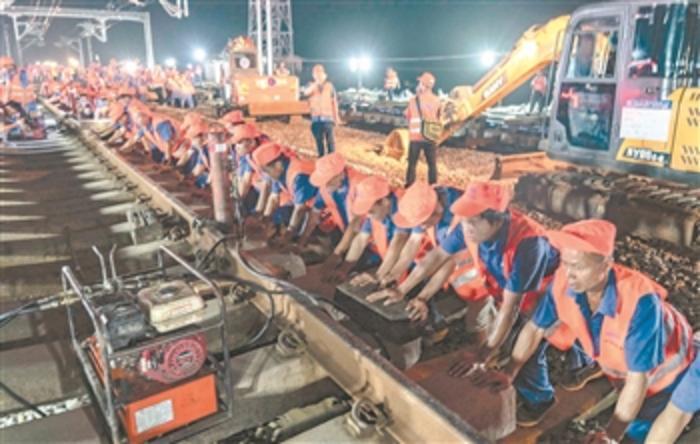 7月18日夜,中铁十一局三公司职工在移走钢轨,以便进行昌赣高铁引入向莆铁路施工。