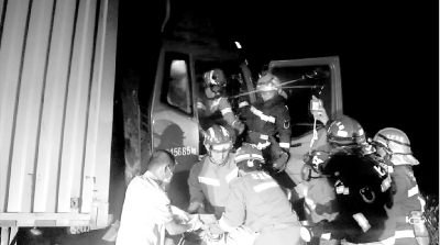 急救人员也钻进驾驶室后,准备对被困司机进行输液。一名消防员为医生照明,另一名消防员一边用手拍打着司机的肩膀,一边不断地安慰提醒这位为生活奔波的司机,“兄弟,你别趴着,起来了,醒醒啊,说话,想想你家里人,睁眼,醒着点。”