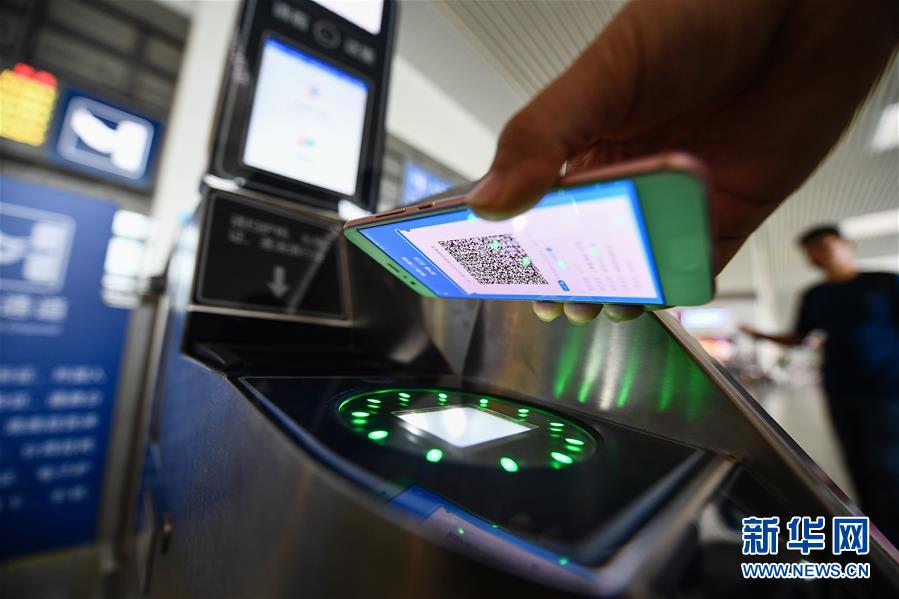 7月27日,铁路南京站候车大厅,一名旅客在刷二维码通过检票闸机进站。新华社记者 李响 摄