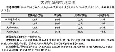 核心 大兴机场线票制票价