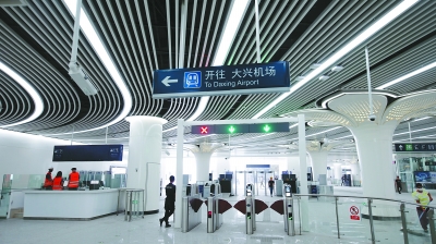 大兴机场线已正式进入试运行阶段。今天上午,记者来到大兴机场线草桥站时看到,大兴机场线的出入口已经搭建完成。大兴机场线出入口闸机均配备了人脸识别功能,今后旅客或可“刷脸乘车”。本报记者 程功摄