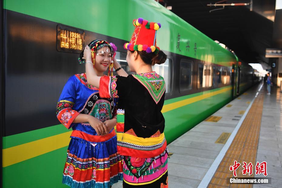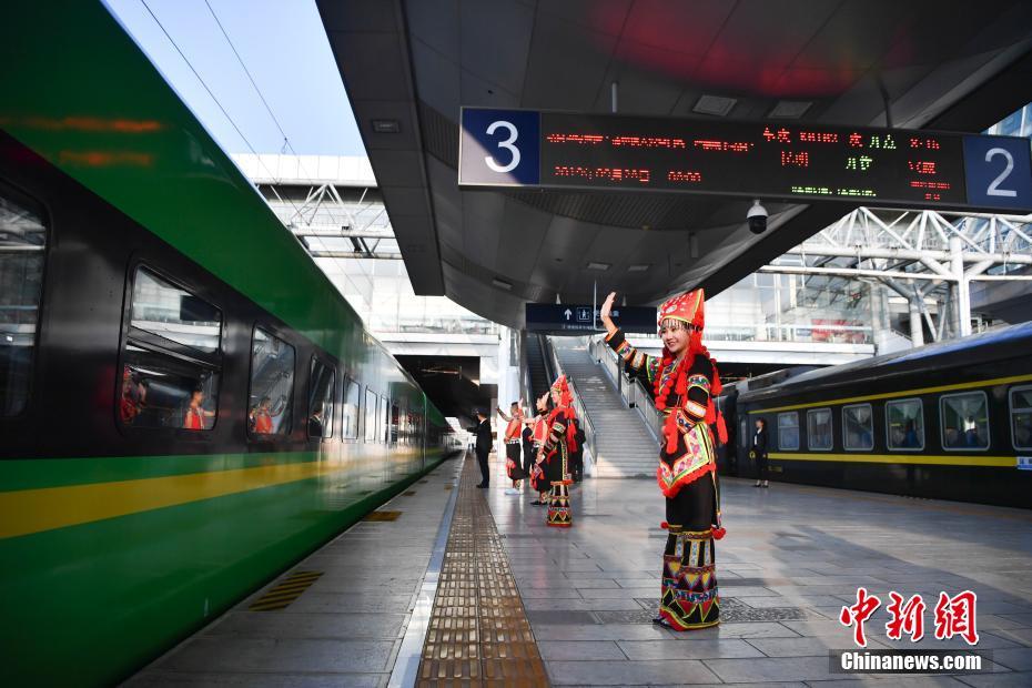 身着瑶族民族服饰的工作人员挥手送别旅客。中新社记者 刘冉阳 摄