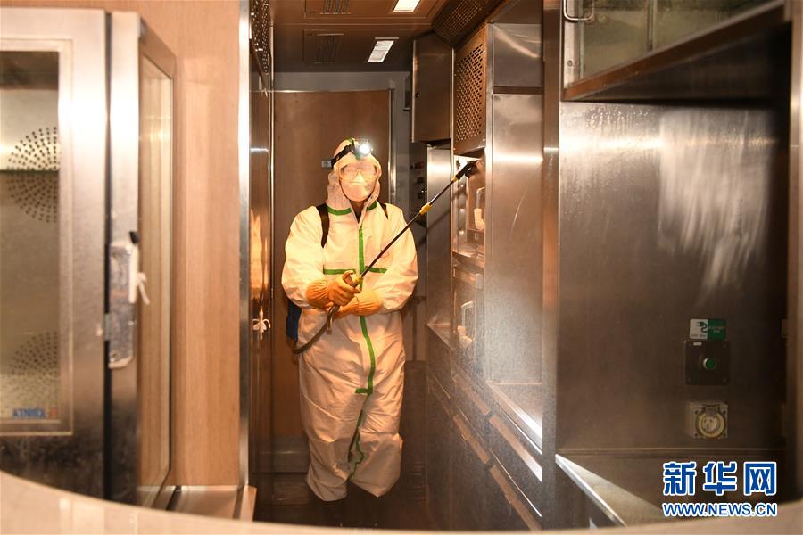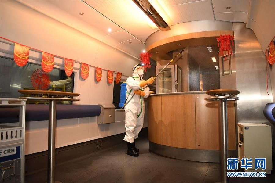 2月2日,工作人员对动车组餐车区域进行消毒。 为做好新型冠状病毒感染的肺炎疫情防控工作,保障乘客安全,中国铁路成都局集团有限公司重庆车辆段联合重庆疾控所对列车进行严格细致的消毒防疫工作。 新华社记者 唐奕 摄