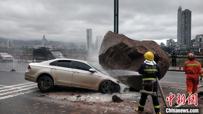 中新网成都10月14日电 (刘学艳)14日11时25分左右,途经四川宜宾城区的国道353线公路白塔山路段附近发生一起山石崩塌灾害,山石砸中公路上行驶的一辆白色的轿车,造成轿车车头严重受损。