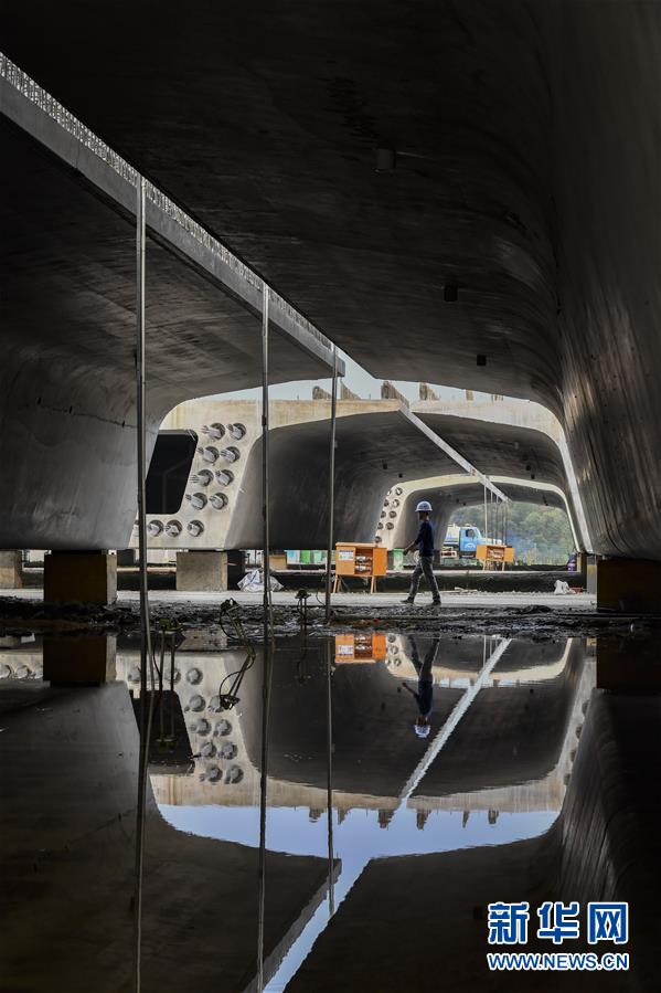 10月13日,工人从中铁十一局常益长铁路望城西制梁场已经完成制作的混凝土箱梁边走过。 目前,常(德)益(阳)长(沙)铁路进入架梁高峰,承担制梁任务的中铁十一局桥梁公司的建设者们昼夜加班赶制,确保铁路桥梁如期架设。 常益长铁路全长157公里,设计时速350公里,是国家“八纵八横”高速铁路网的重要组成部分。 新华社发(王荃荃 摄)