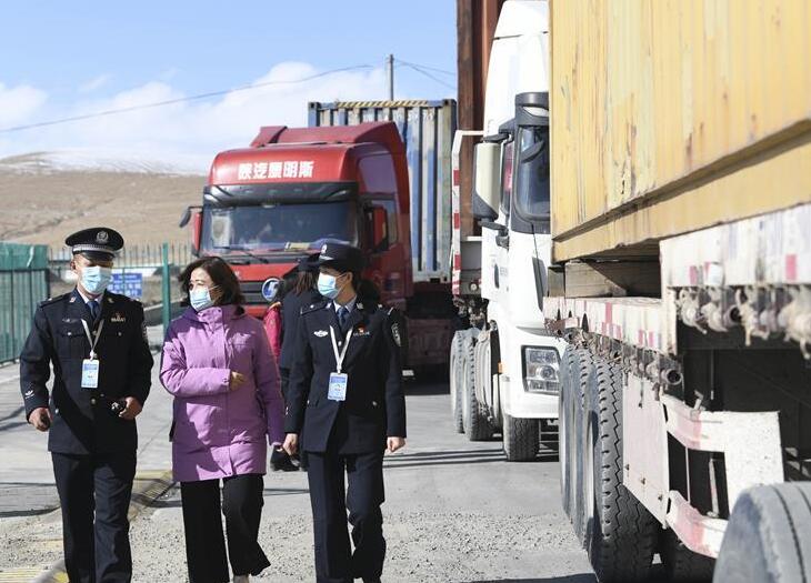 在新疆卡拉苏口岸,喀什地区外事办公室工作人员与卡拉苏出入境边防检查站执勤民警一起检查出境车辆(10月16日摄)。 进入十月,位于帕米尔高原的新疆卡拉苏口岸繁忙如常。口岸采取严格闭环式管理的通关模式,保证“一带一路”沿线对外贸易的畅通。