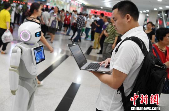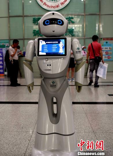 5月8日,福建省首台导医机器人“小医”在福州市的福建省立医院门诊大楼,吸引前来就医民众的围观、咨询。“小医”是福建省第一台引入并投入使用的导医机器人。该导医机器人在该医院投入试用一个多月来,通过语音识别、语音合成自然语音理解等技术,已与逾千位患者交互问答,提供导诊与院内导航等服务,比如如何挂号、建卡,洗手间在哪、药房在哪,去哪抽血、轮椅在哪里等等。