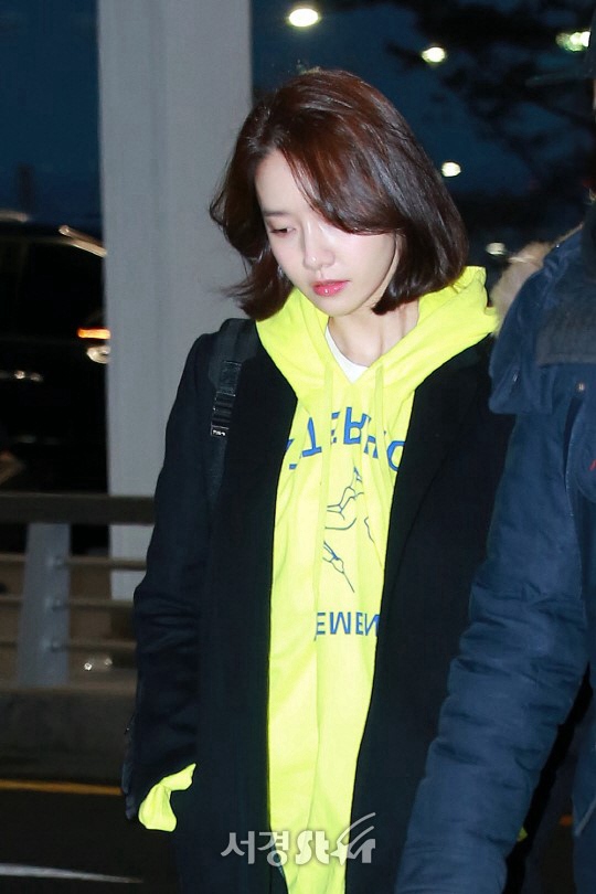 林允儿上身穿荧光绿卫衣搭配黑色外套,下身穿牛仔裤搭配黑色运动鞋,整体造型彰显舒适简约风。