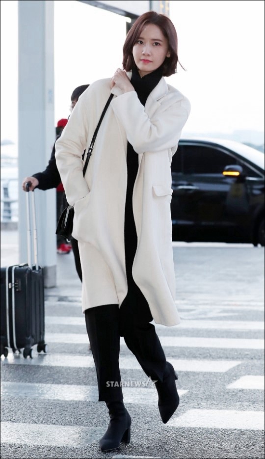 林允儿身穿白色大衣搭配黑色高领毛衣,下面穿9分裤搭配黑靴,整体造型时尚干练,不仅温暖加倍,也能更好地凸显温柔的气质。