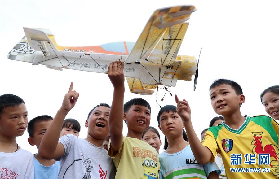 7月19日,四川省华蓥市永兴镇的留守儿童在乡村少年宫欣赏航模。 新华社发(邱海鹰 摄)