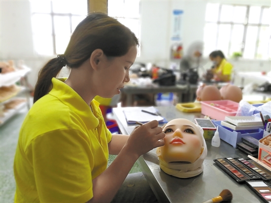 在三楼的半成品区,女工吴永美面前的粉底、腮红、眼影一字排开,她的工作是给模特的面部画上合适的妆容。在不辨五官的球形胶体上,吴永美在眼部开口处填进棉花和塑料眼珠,贴上假睫毛,然后用画笔细细画出眉形,处理一个头部妆容需要40分钟到一个小时。