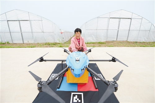 近日,陕西武功县福瑞特现代农业园区的农业工人夏西霞将刚刚采摘的乳瓜装上无人机。 新华社记者 李一博摄