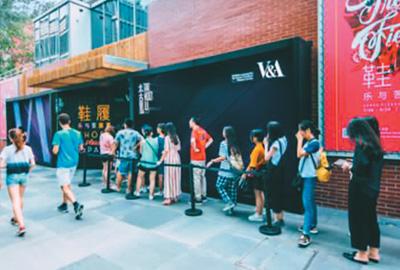 7月26日-8月26日,《鞋履:乐与苦展览》在北京三里屯太古里北区红馆展出。图为游客在参观展览。(人民网)