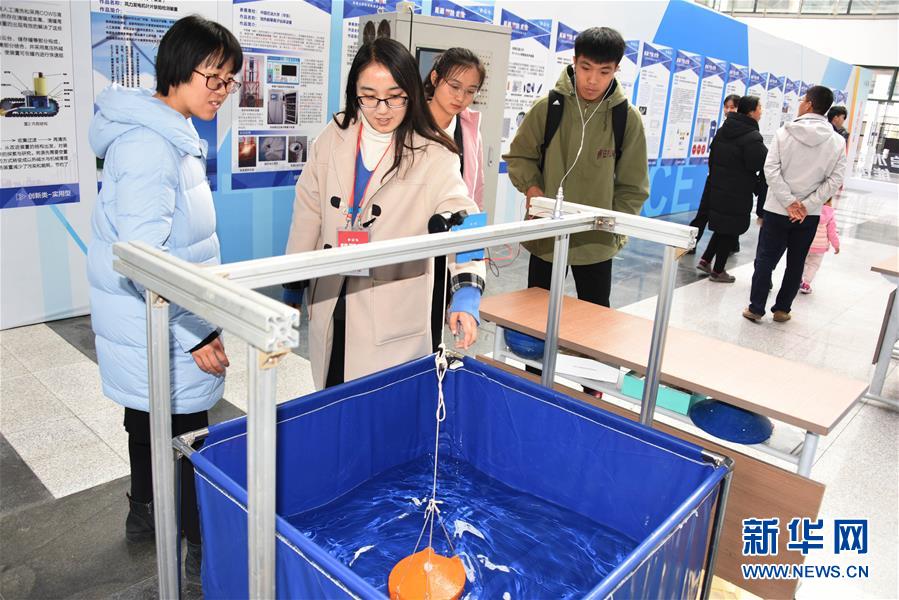 11月25日,在大赛创新成果展上,观众在参观由上海交通大学带来的海上秋千式防波发电装置。新华社记者李紫恒摄