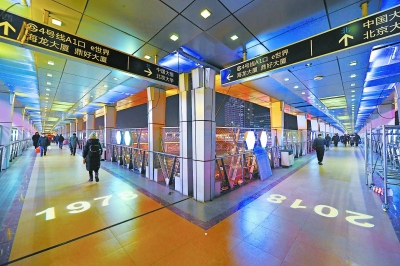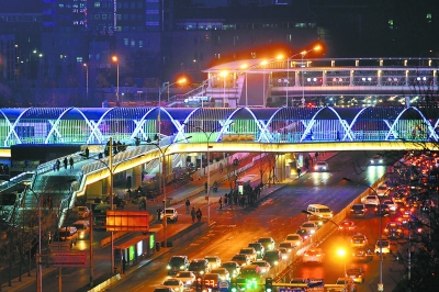 中关村一号桥过街天桥上新装了许多灯光设施,让人感受到40年中关村的发展变化。