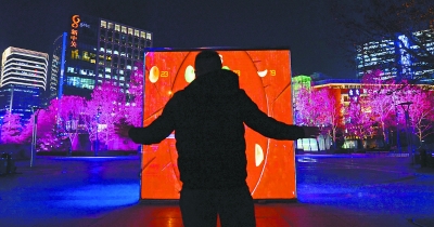 另外,在夜景照明设计的过程中,设计师还充分彰显海淀的科技魅力,采用动作捕捉、光影互动等新技术,提升公共空间的参与性与趣味性。比如,中关村广场东北角,设置了两个“屏立方”雕塑,采用高清半透反射膜及碳纤维高清LED屏叠加制作,市民可以驻足在此体验体感互动新技术,可以根据环境亮度实现不同内容不同模式的切换,增添逛街的趣味性。