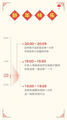据悉,除夕当天,20:00到20:59成为除夕送祝福的高潮。而在春晚开始前的19:00到19:59,则成为大家用朋友圈和视频动态记录除夕瞬间的高峰时段。