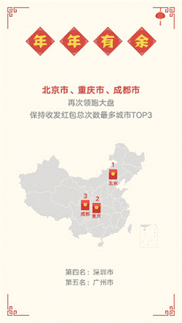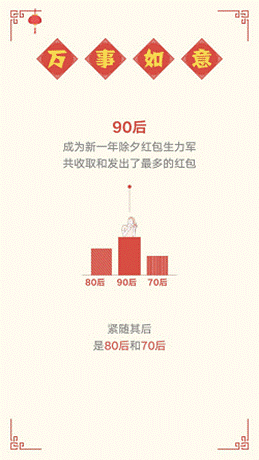 经济日报-中国经济网北京2月6日讯(记者李方) 说到新年,微信红包不能缺席。2月5日,微信官方公布数据报告显示,在今年的除夕红包军团中,90后用户一跃成为主力军,收取和发送红包数量都占据首位,80后和70后则分别位列二三。北京市、重庆市、成都市再次稳居收发红包总次数最多的城市前三,深圳市、广州市紧随其后。