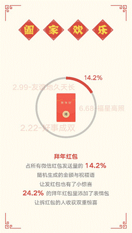 除了普通红包外,微信推出的拜年红包、表情红包和定制红包封面成为今年的一大特色。其中,能够随机生成不同金额和祝福语的拜年红包,占除夕所有红包发送总量的14.2%,24.2%的拜年红包里添加了表情包。