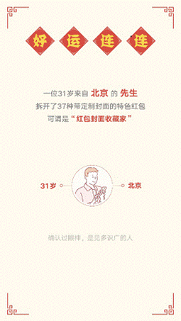 定制红包封面也格外受到欢迎,大家纷纷在网上晒出“别人家的红包”。一位来自北京的31岁男性用户,在一天内拆开了多达37种带定制封面的特色红包,可谓是“红包封面收藏家”了。此外,今年用户可以领取公司为员工定制的微信红包封面,在境外使用微信支付消费,也有机会获得带有当地特色的红包封面。