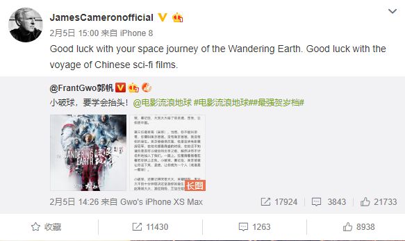 正如好莱坞大导演詹姆斯·卡梅隆在社交媒体上对《流浪地球》发出的祝愿:“祝中国科幻电影之旅好运!”