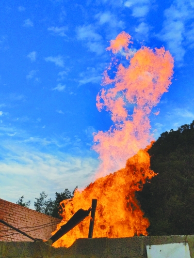 鄂阳页2HF井震旦系陡山沱组页岩气压裂试气点火放喷(火焰高度10余米)。