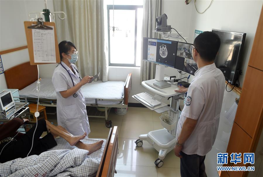 6月28日,诸暨市中心医院医共体姚江分院全科医生蒋玲飞(左)在中心医院专家远程指导下检查病人身体。 新华社记者 韩传号 摄
