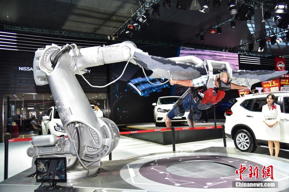 9月18日,第九中国-东盟(柳州)汽车工业博览会在广西柳州市开幕。当天,现场有超过300款车型集中展示,其中的VR设备和大学生方程式赛车等“新鲜物件”,吸引民众的眼球。此次的VR设备可将体验者悬吊在空中,进行沉浸式体验,吸引不少民众排队。而广西科技大学的大学生方程式赛车,则凭借超低坐姿和科技感的造型吸引了民众乘坐体验。图为机械臂造型的VR设备将观众悬挂在半空中。王以照 摄