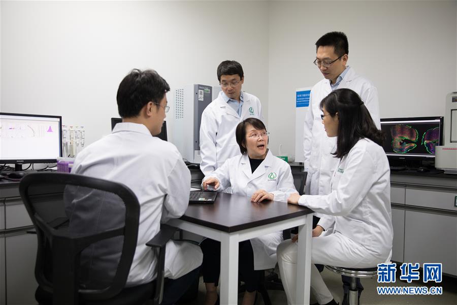 11月3日,新药主要发明人、中科院上海药物所研究员耿美玉(左三)在绿谷研究院和研发团队讨论研究进展。 新华社记者 金立旺 摄