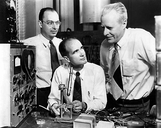 晶体管发明人约翰·巴登(左)、威廉·肖克利(中)、瓦尔特·布拉顿(右)