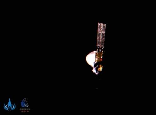 茫茫宇宙中银色的着陆巡视器和金色的环绕器熠熠生辉。这是我国天问一号探测器首次深空“自拍”,以此向祖国报告平安,表达生日祝福。