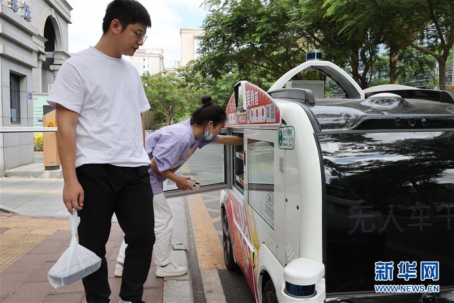 11月6日,在厦门湖里创新园内,人们通过手机扫码支付后领取餐食。 近日,4辆无人驾驶餐车在福建省厦门市湖里创新园投入使用。穿梭在创新园的无人驾驶餐车可装载200余份早餐或100余份午餐、晚餐。餐车设有保温装置,通过手机扫码完成支付,人们就可领到选购的餐食。 新华社发(曾德猛 摄)